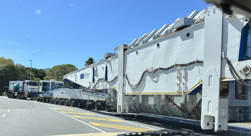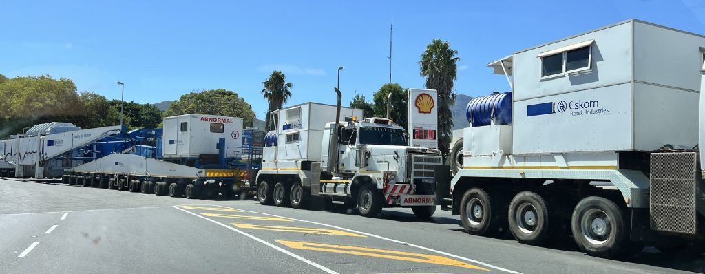 Auf der Weiterfahrt ein ungewöhnlicher, langer Schwertransporter mit einem Transformator der staatlichen Elektrizitätsgesellschaft Escom. Bis zu diesem Wochenende gab es fast 1 Jahr lang kein Load Shedding, also Stromabschaltungen.