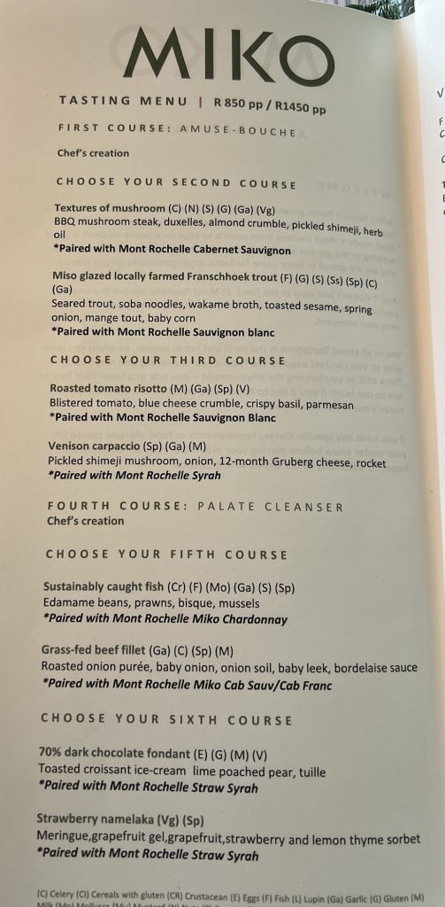 Auf das Abendessen bei Sir Richard Branson‘s Mont Rochelle Restaurant Miko hatten wir uns schon lange gefreut. Auch wegen des Ausblicks und der guten Weinbegleitung.