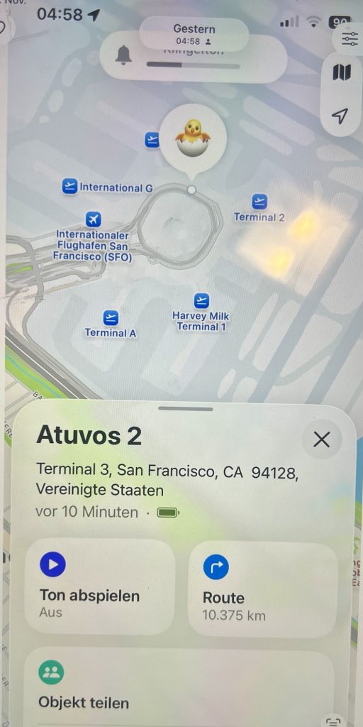 Da wir aber seit einiger Zeit in allen Koffern AirTags haben, konnten wir sehen, das unsere zweite große Tasche in San Francisco (!) gelandet war.