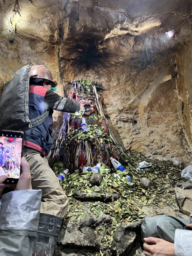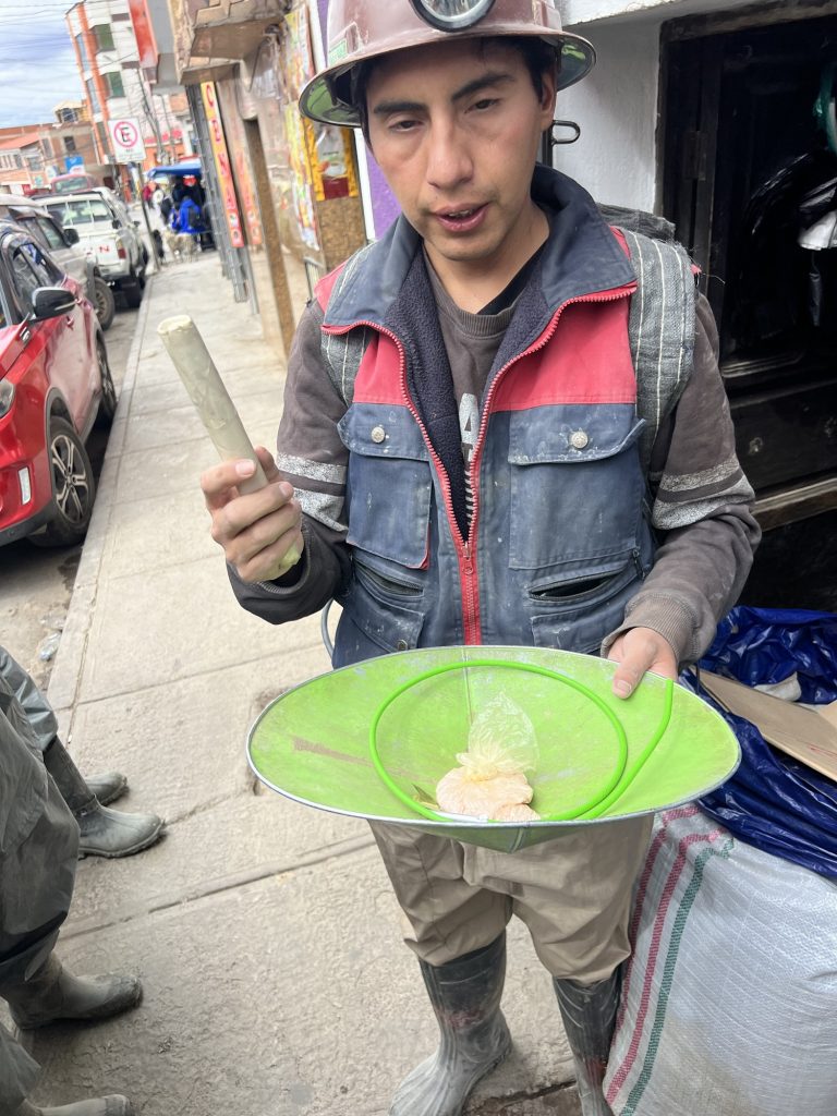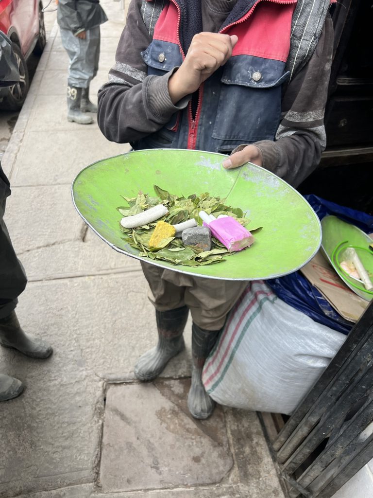 Dann ging es in einen typischen Shop, in dem auch die Minenarbeiter einkaufen. Jeder der Gruppe hat dort einen kleinen Geschenkbeutel gekauft. Dieser bestand aus Coca Blättern, etwas Süßem, das zusammen damit gekaut wird, etwas hochprozentigem Schnaps und einer Limonade.