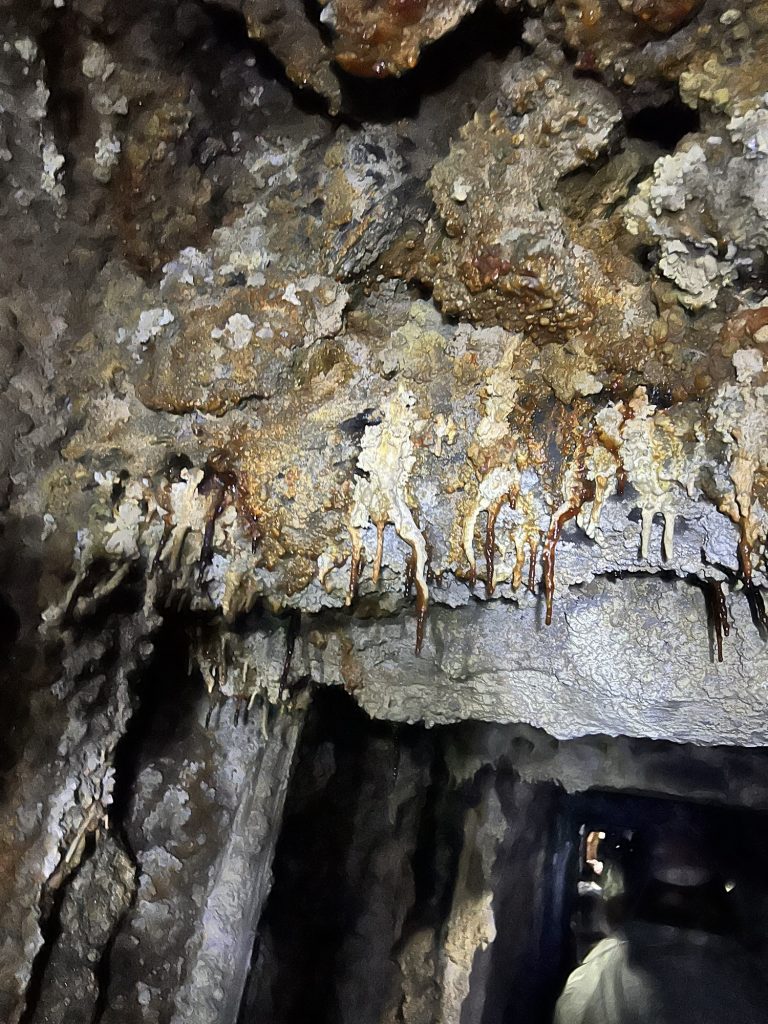 Zunächst wurden wir entsprechend eingekleidet. Mit wasserdichten Hosen und Jacken, Gummistiefeln, Helmen und Grubenlampen. Zu diesem Zeitpunkt wussten wir noch nicht, dass wir das alles wirklich brauchten.