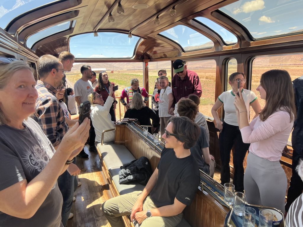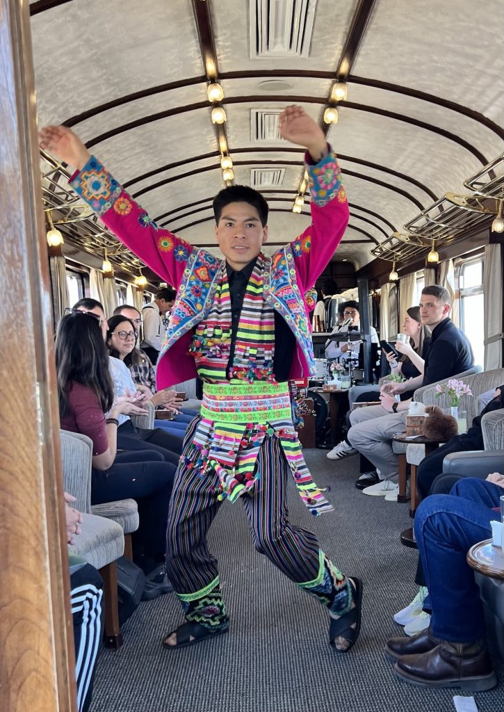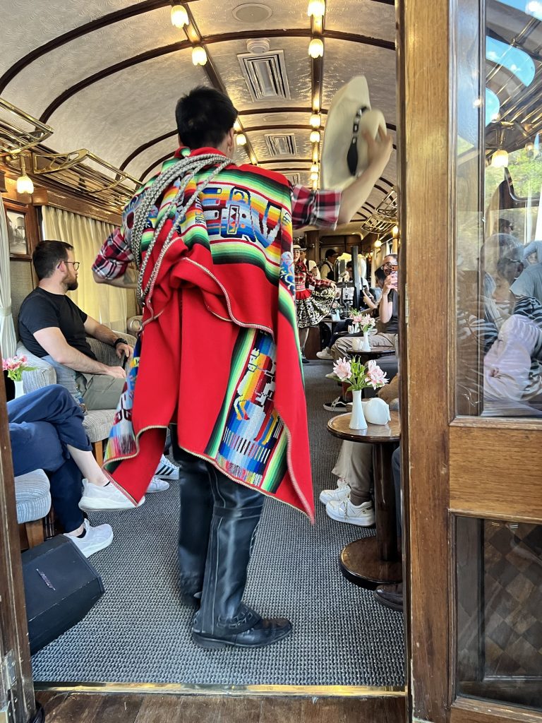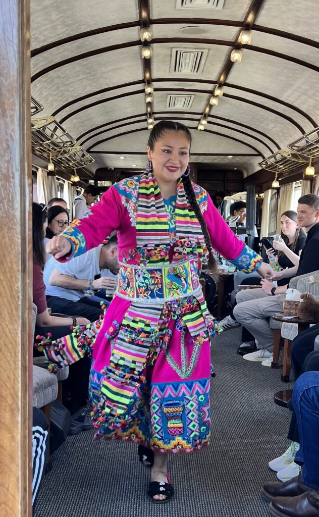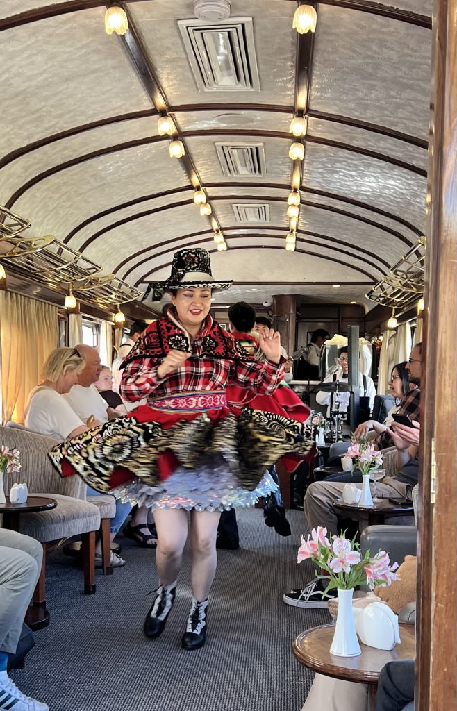 Im Zug beginnt dann nun das Unterhaltungprogramm mit Live Musik einiger internationaler und dann landestypischer Hits. Dabei auch Tanzvorführungen aus der Region Puno. Und danach die Modenschau. Das alles bei Snacks und Freigetränken, auch alkoholisch. Am Ende tanzen alle zusammen.