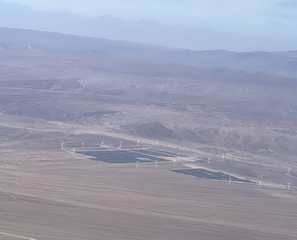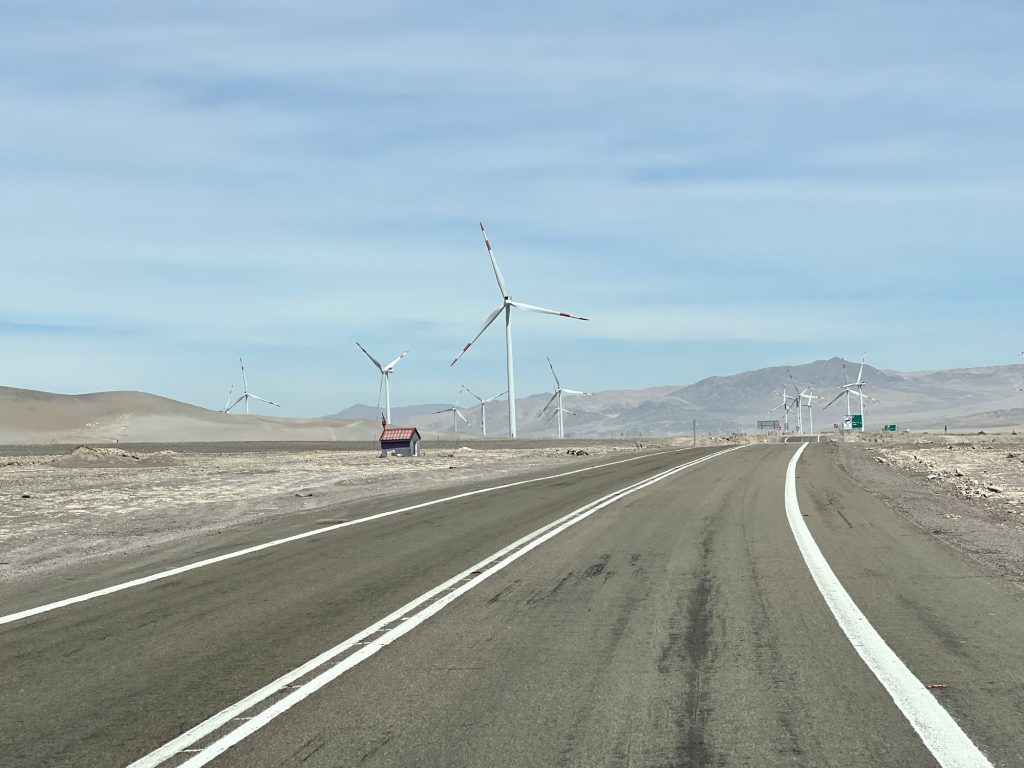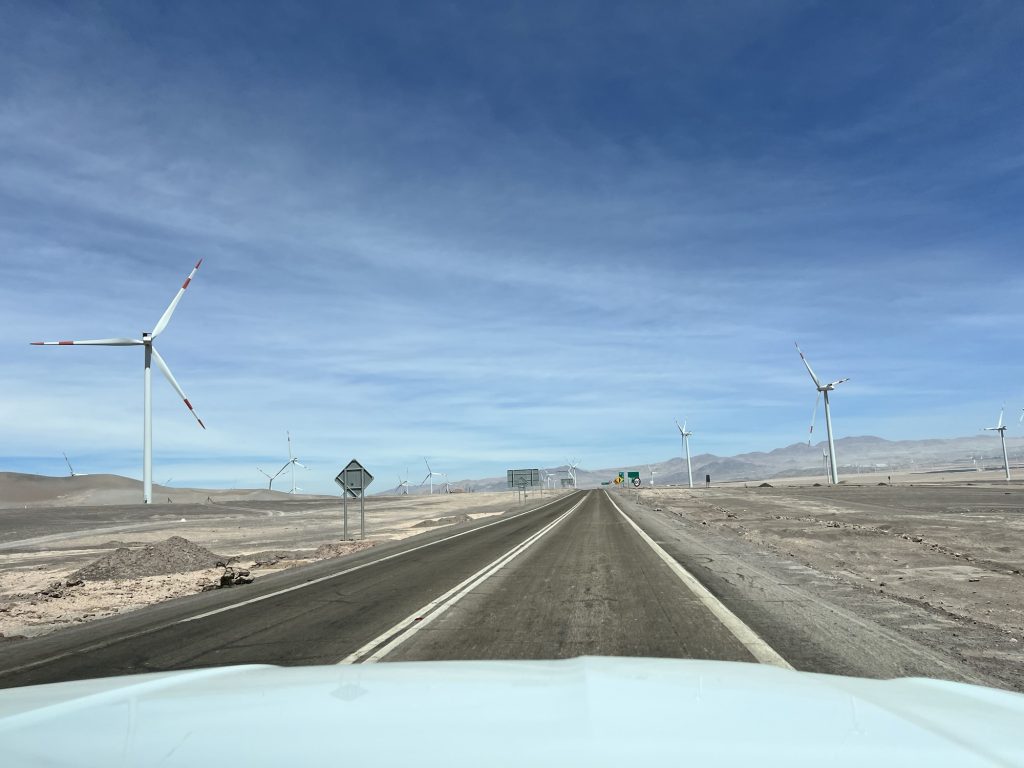 Es geht langsam bergab und auf Calama zu. Unterwegs auch viele Windräder, produziert von ENEL, dem italienischen Stromanbieter und Photovoltaik Fabriken, die den Wind und die viele Sonne nutzen.