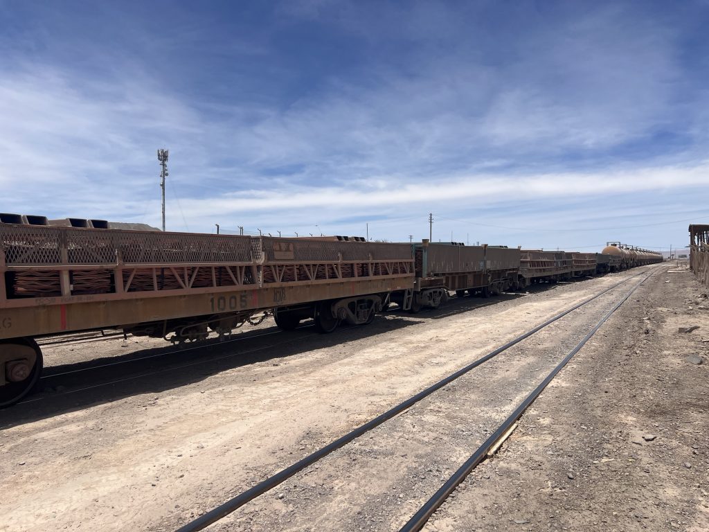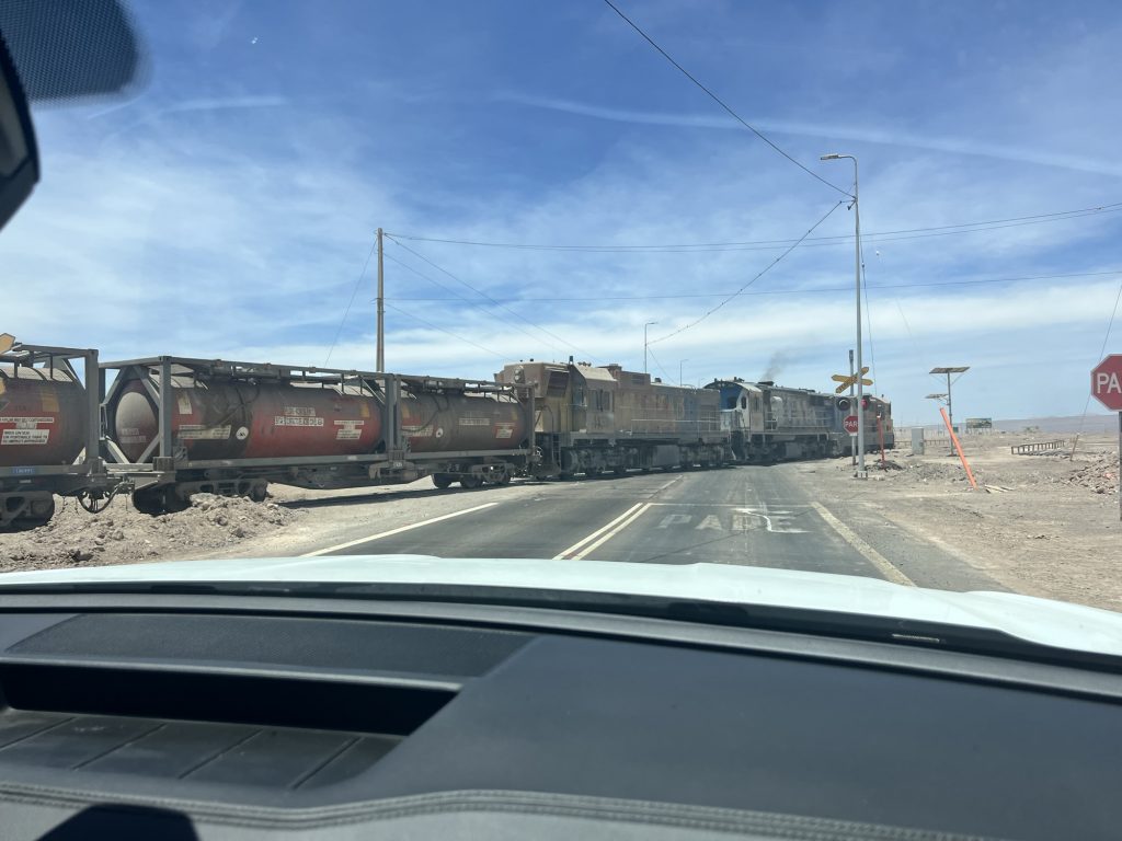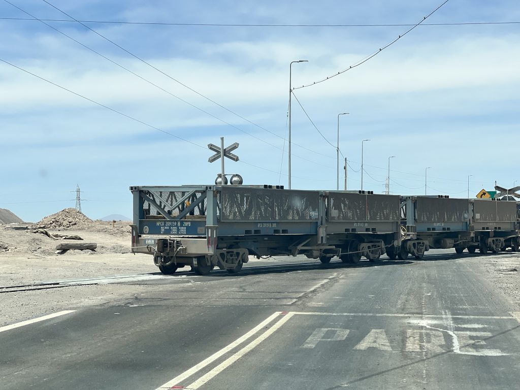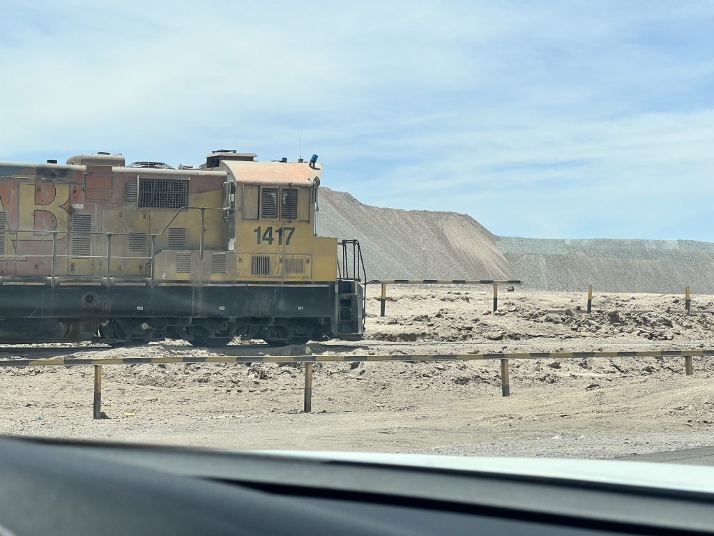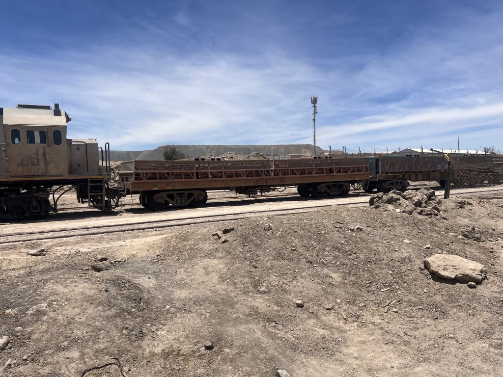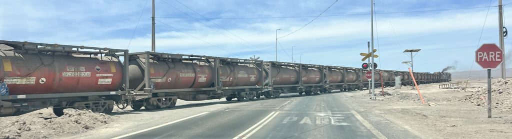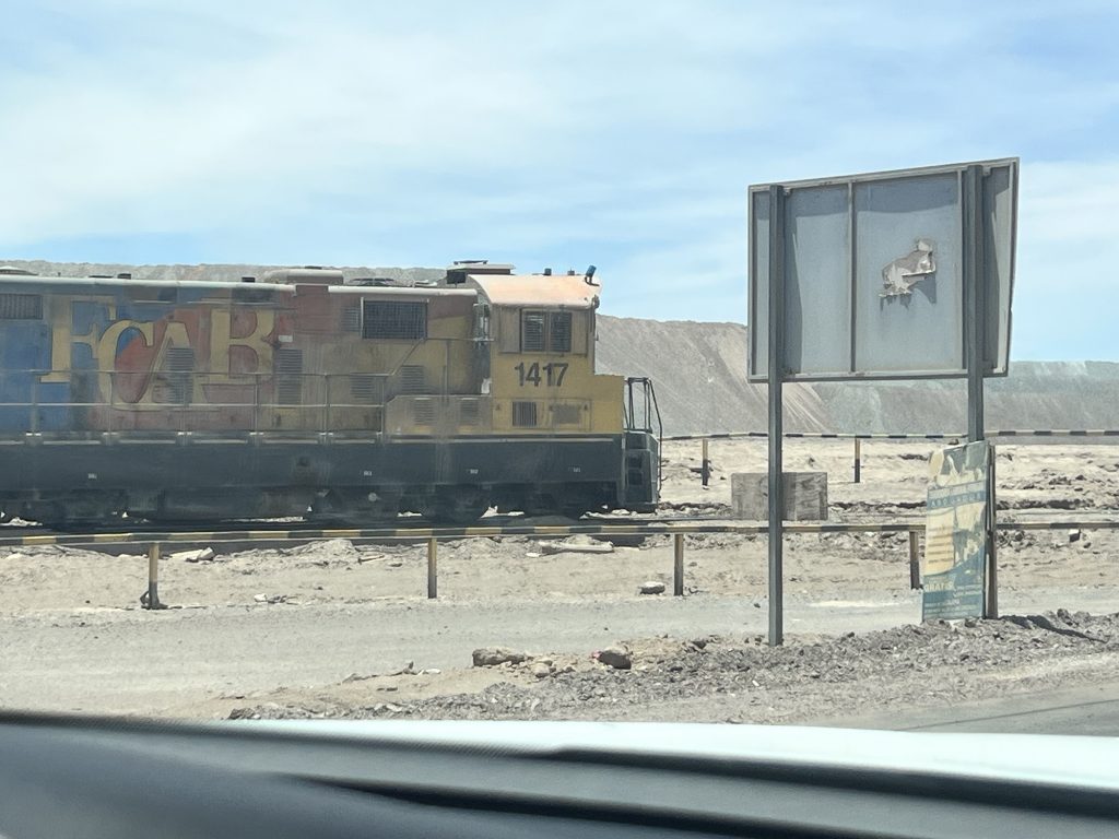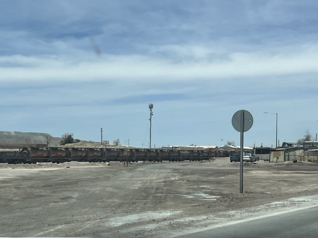 Und dann stand im Bahnhof von Sierra Gorda ein Zug. Leere Schwefelsäure Waggons und mit Kupfer voll geladene Plattenwaggons. Auf dem Weg runter nach Antofagasta ans Meer.
