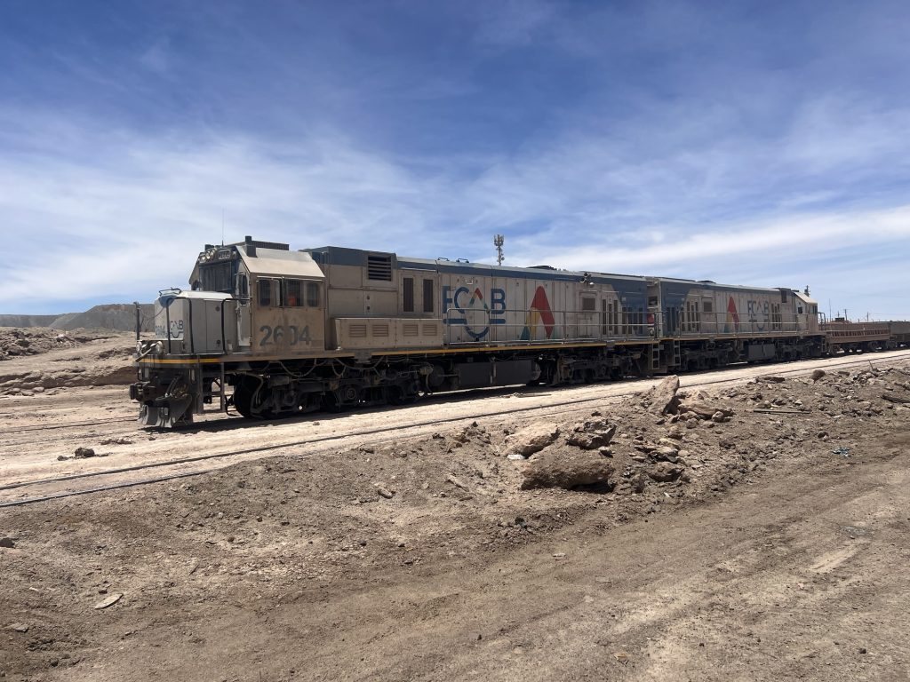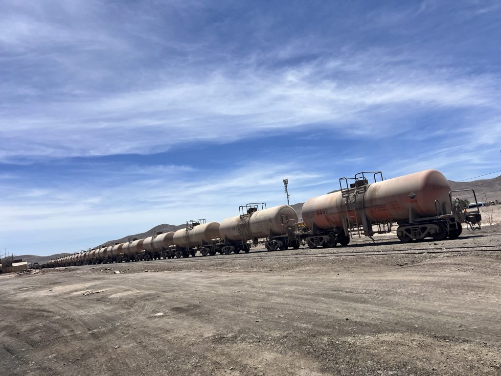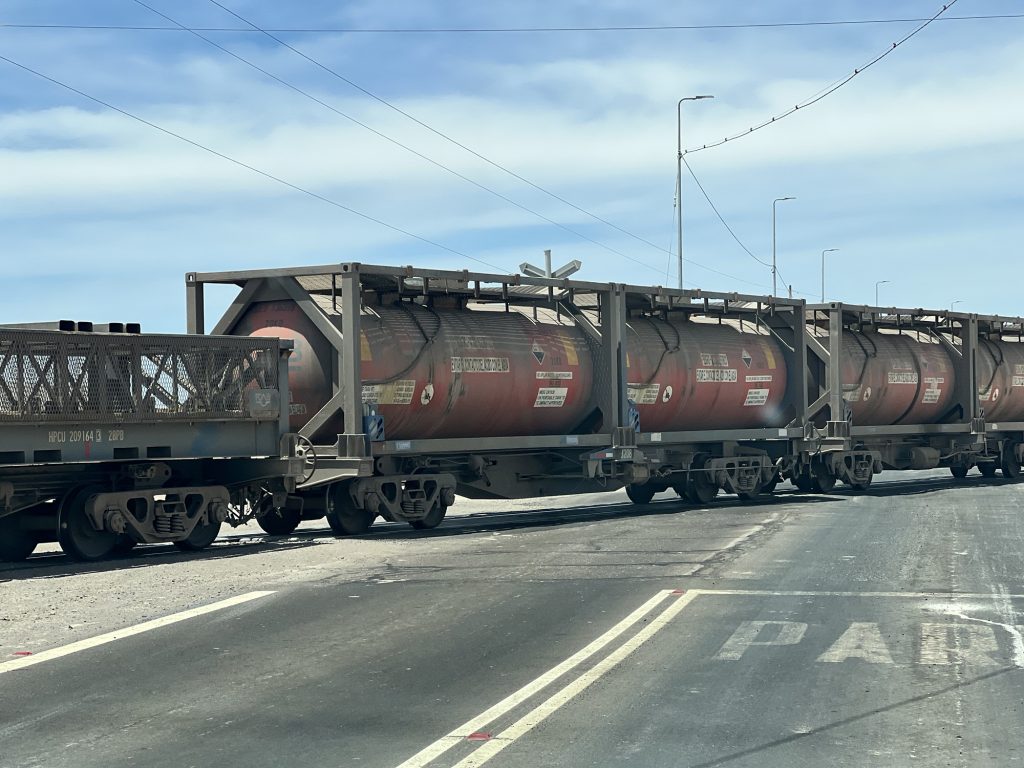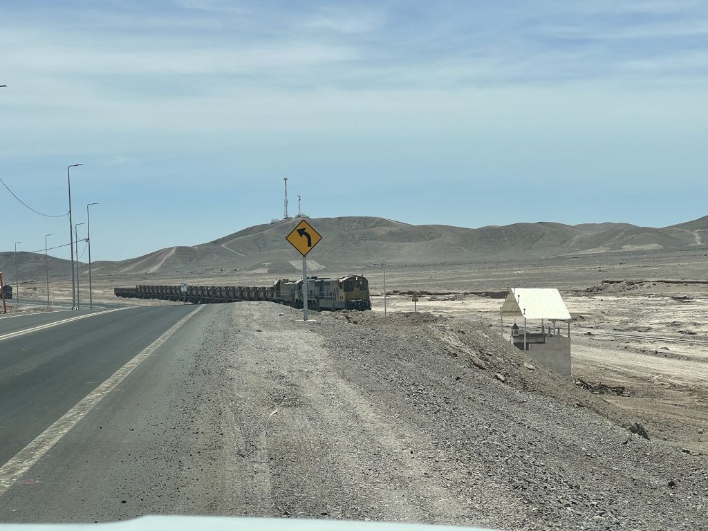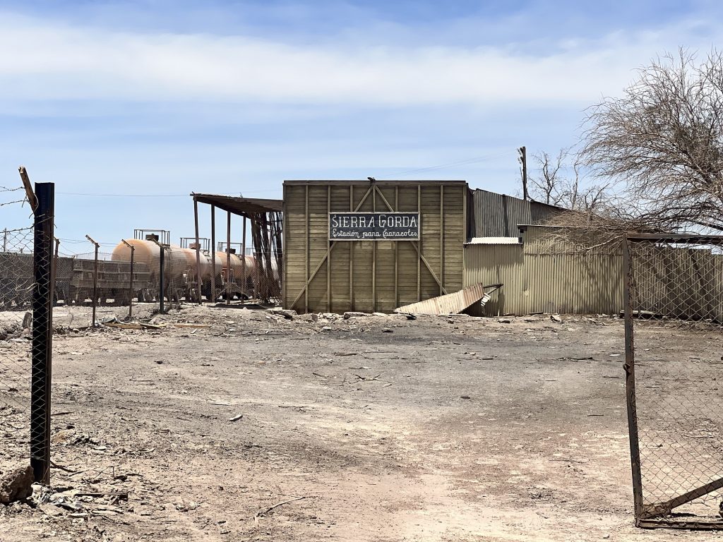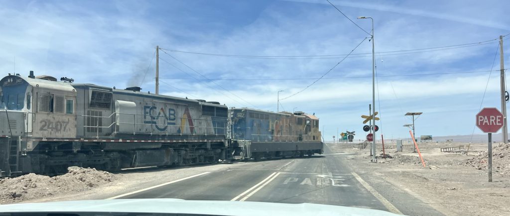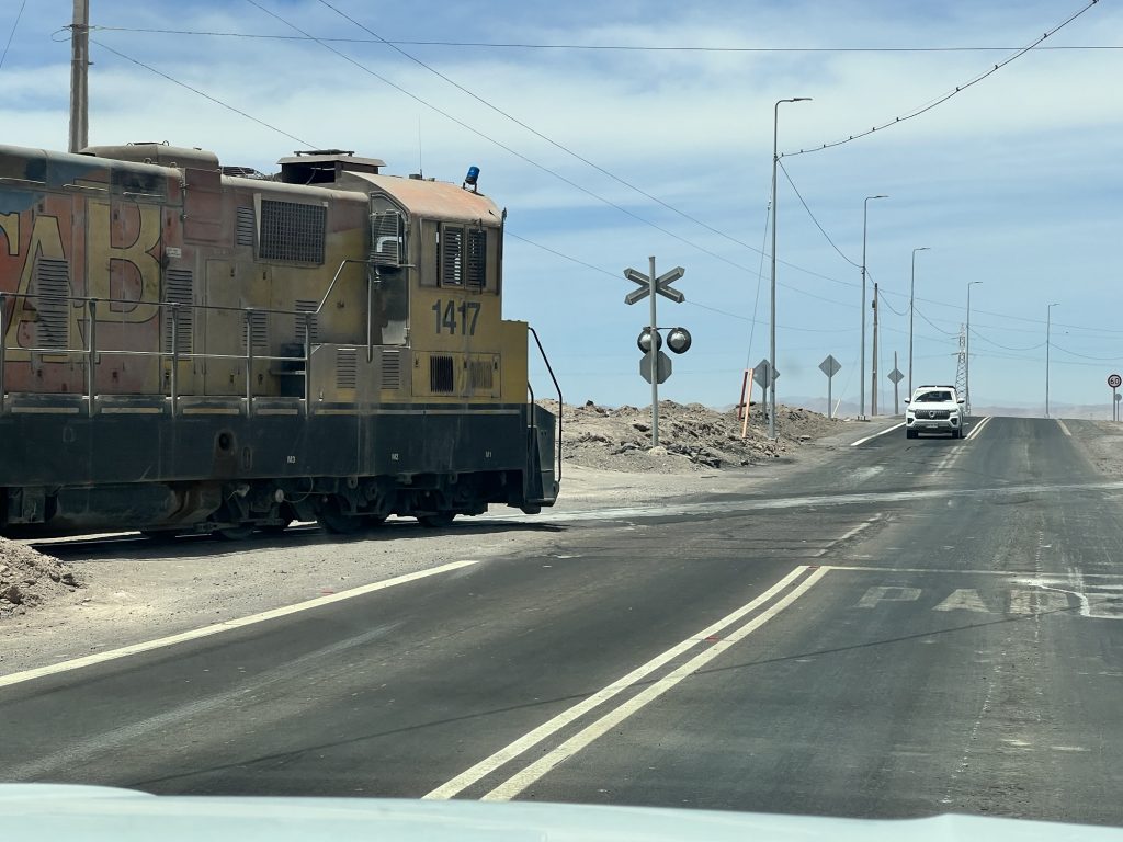 Und dann stand im Bahnhof von Sierra Gorda ein Zug. Leere Schwefelsäure Waggons und mit Kupfer voll geladene Plattenwaggons. Auf dem Weg runter nach Antofagasta ans Meer.