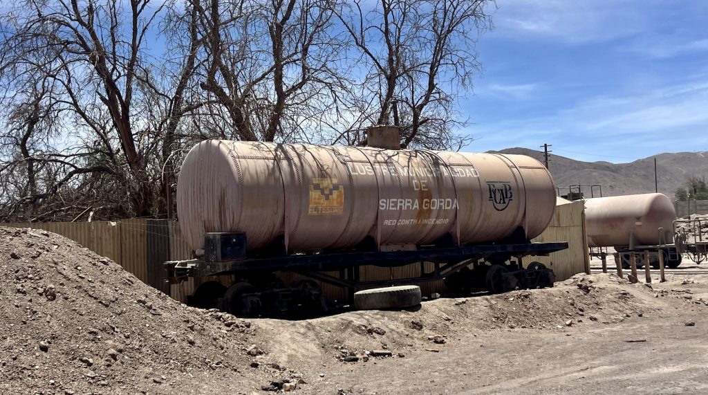 Parallel läuft die Eisenbahn Strecke, über die die Minen hauptsächlich mit Schwefelsäure versorgt werden, um das Kupfer zu gewinnen. Kupfer Platten werden dann als Halbfertigprodukte in den Hafen von Antofagasta transportiert. Ob wir wohl das Glück haben, einen Zug zu sehen? Da wir noch Zeit bis zum Flug in die chilenische Hauptstadt haben, entscheiden wir, bis nach Sierra Gorda zu fahren. Auf der neuen Autobahn kein Problem und bei erlaubten 120 km/h schnell zu erreichen.