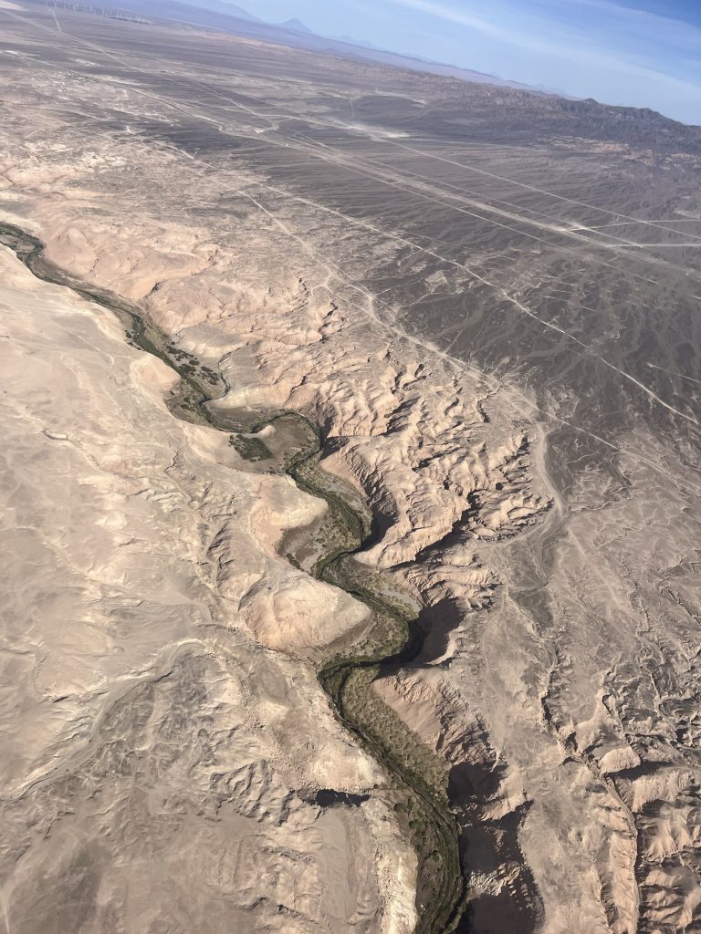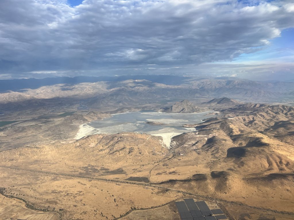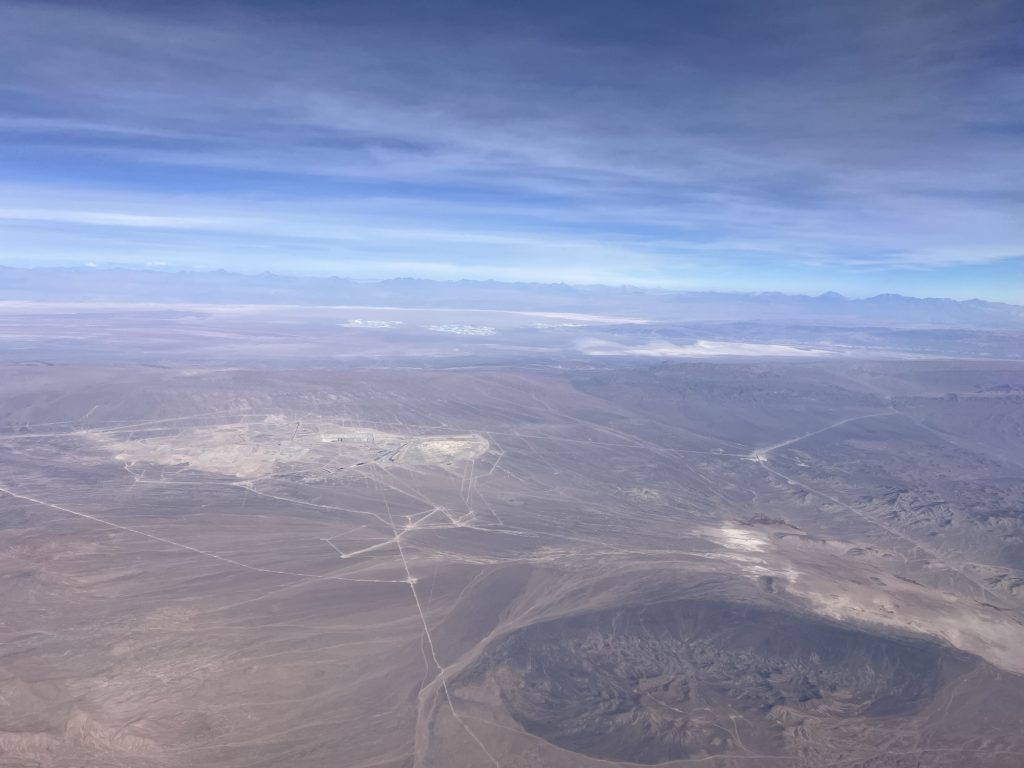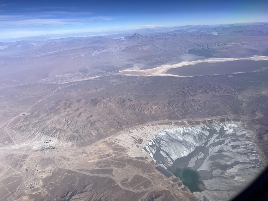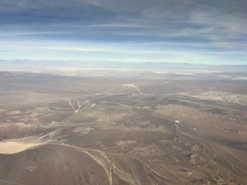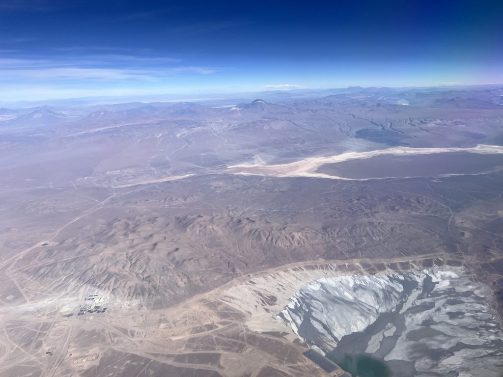 Es geht entlang der Anden Kordilliere über viele Minen hinweg, mit tollen Bergen am Horizont und schräg unter uns und auch immer wieder über Salzseen entlang.