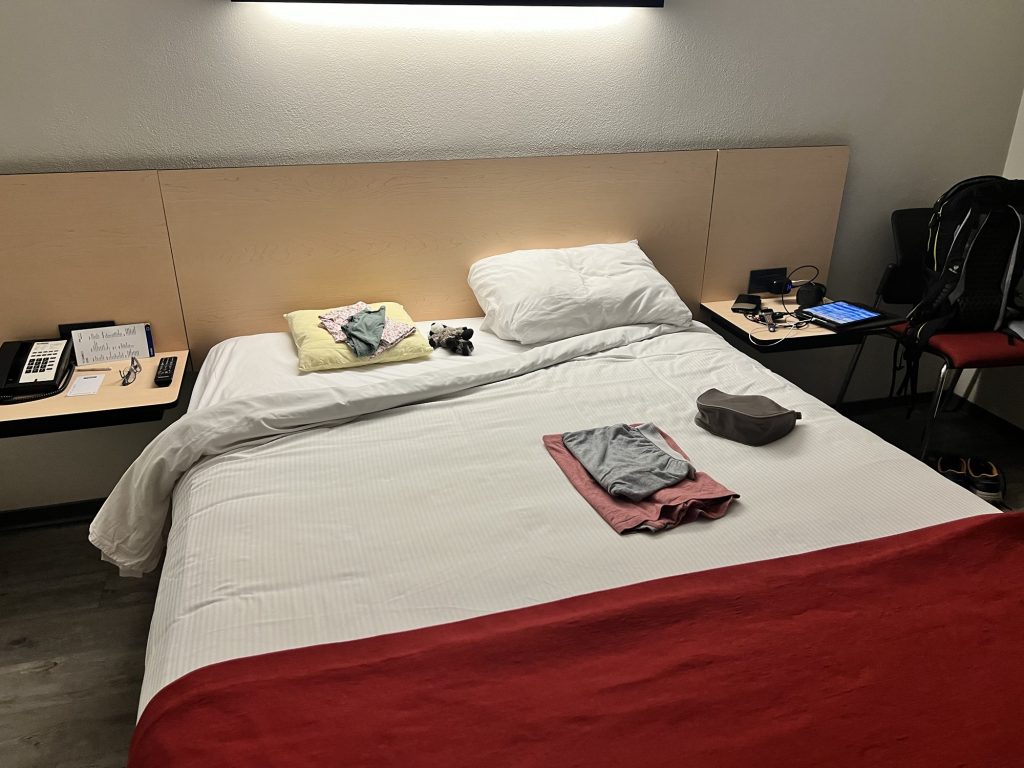 Das Hotel ist so lala, aber in Flughafen Nähe, aus der Marriott Gruppe und wir lassen zwei große und einen kleinen Koffer hier und reisen morgen mit leichtem Gepäck weiter.
