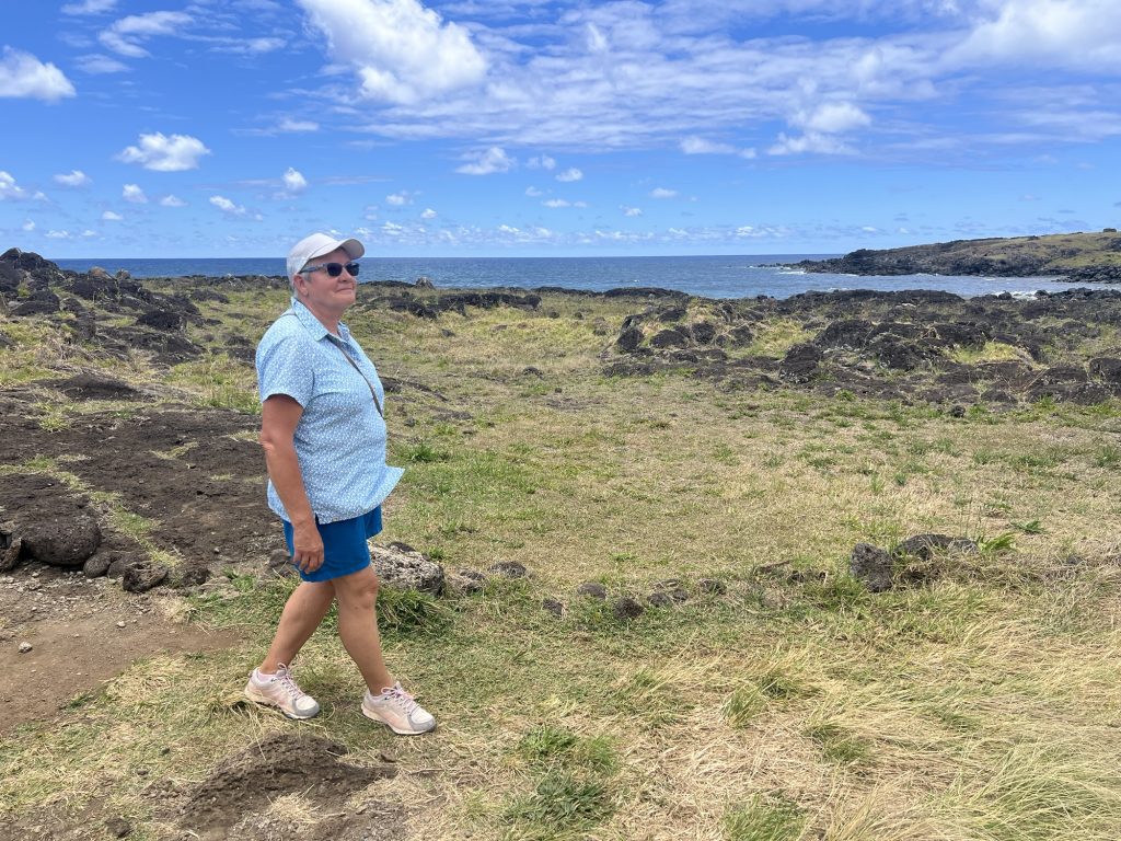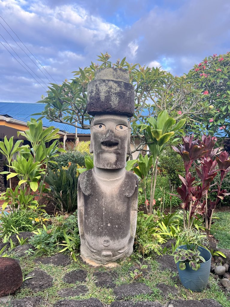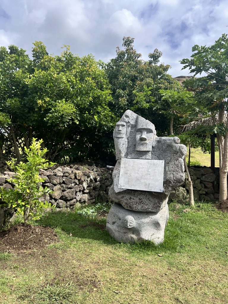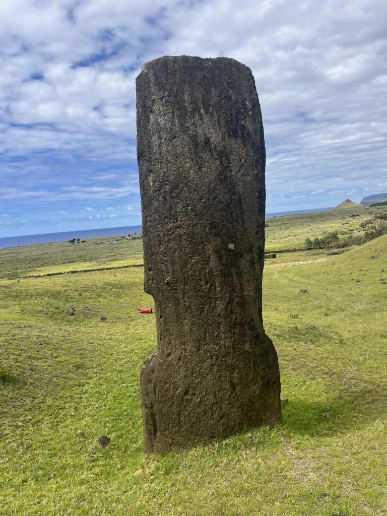 Dann ging’s zum Strand. Hier seht die Statue, die Thor Heyerdahl in den 1950ern zusammen mit Einheimischen und mit Hilde von Seilen und Hebel als erste wieder aufgerichtet hat.
