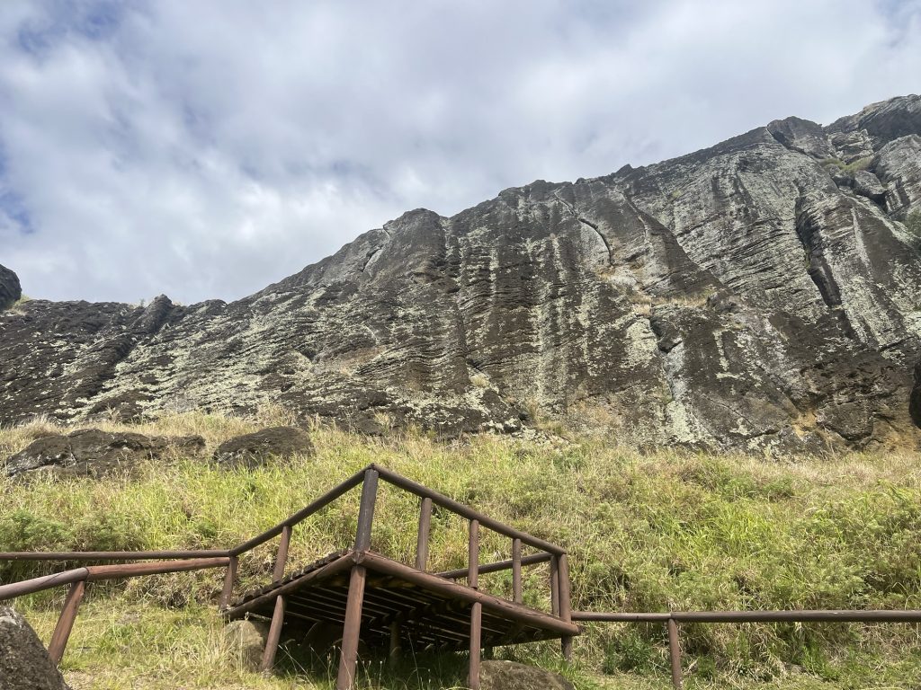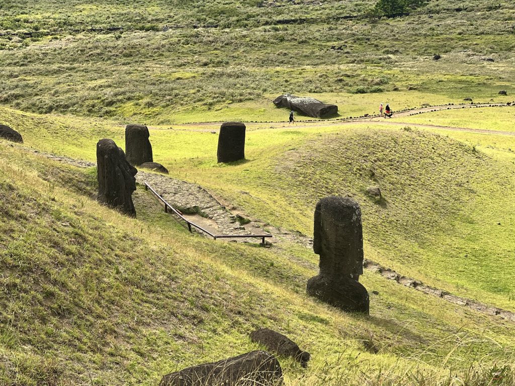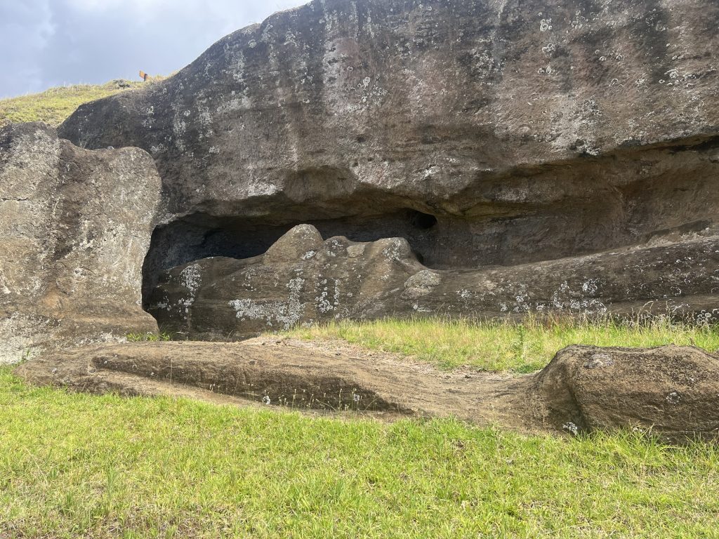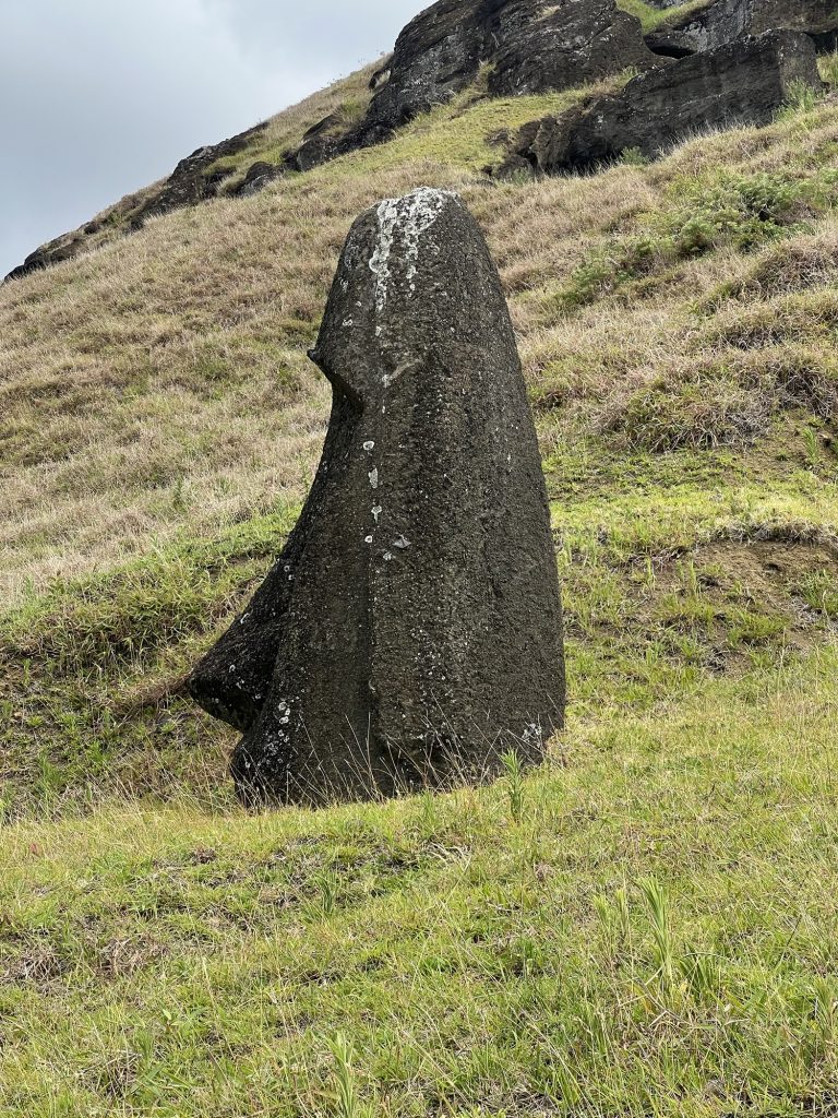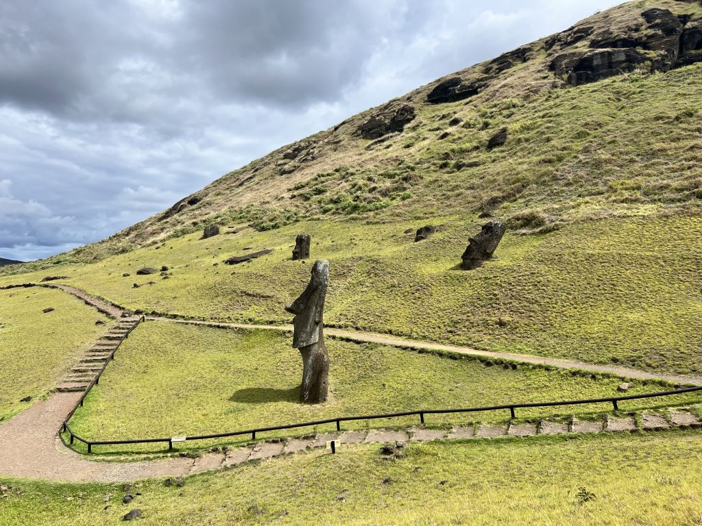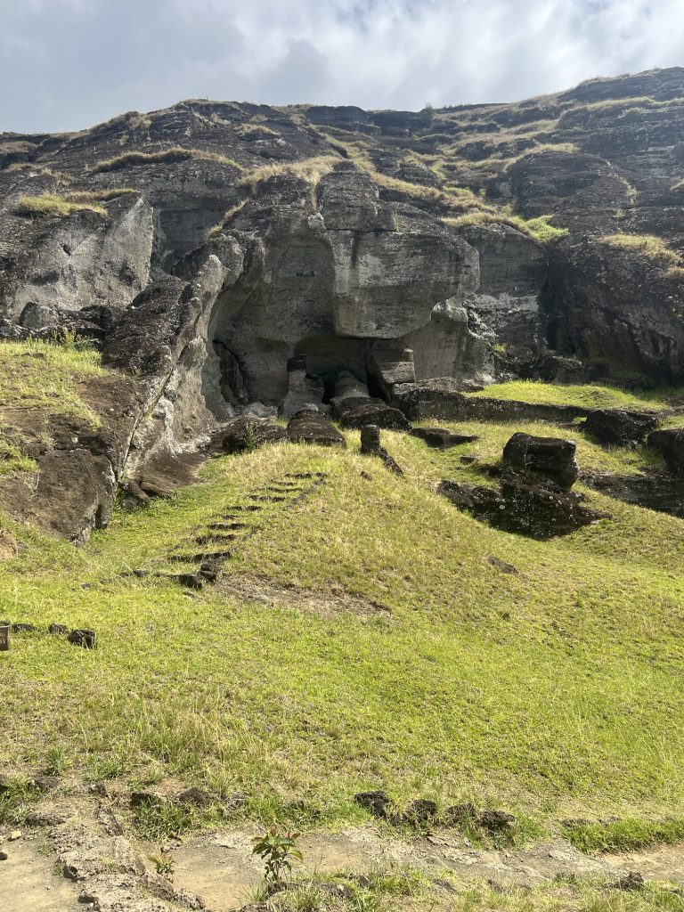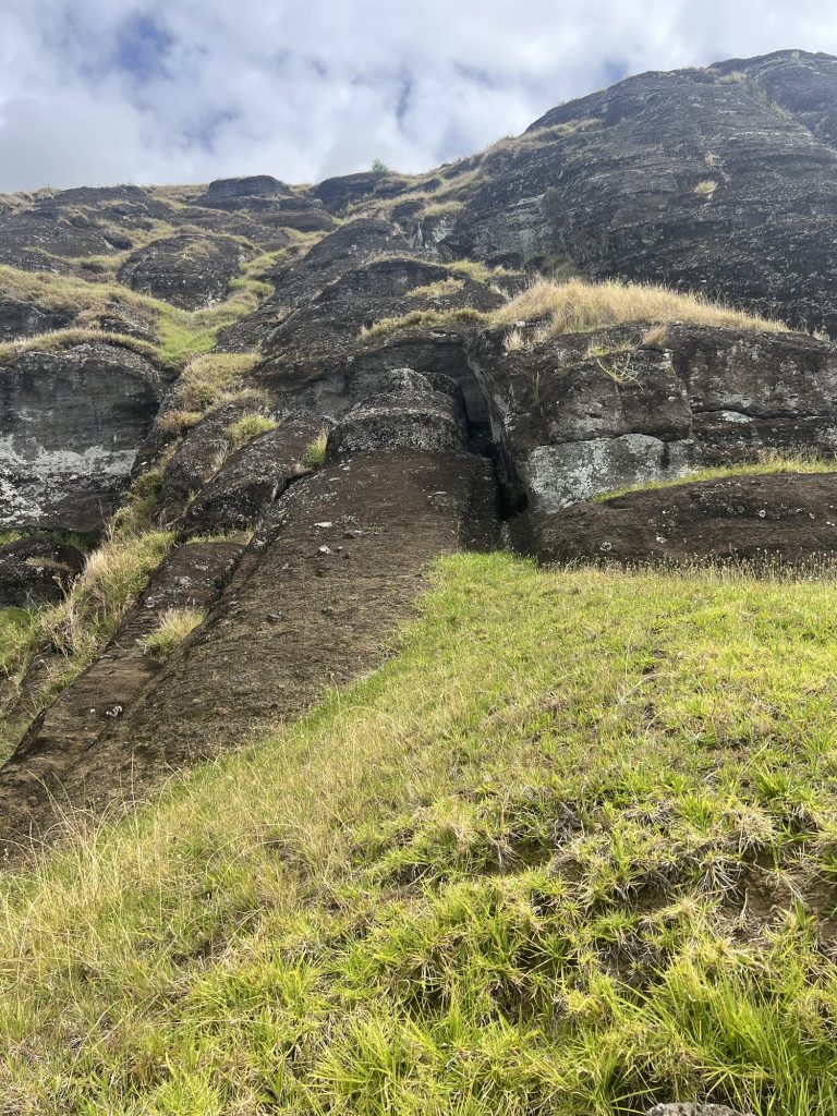 Besonders beeindruckend war es im Steinbruch, wo die Statuen hergestellt wurden. Neben den fertigen und nicht abtransportierten Moais sind auch alle Stufen der Produktion zu sehen. Es wurde der Tuffstein verwendet, der viel leichter als der Basalt zu bearbeiten ist.