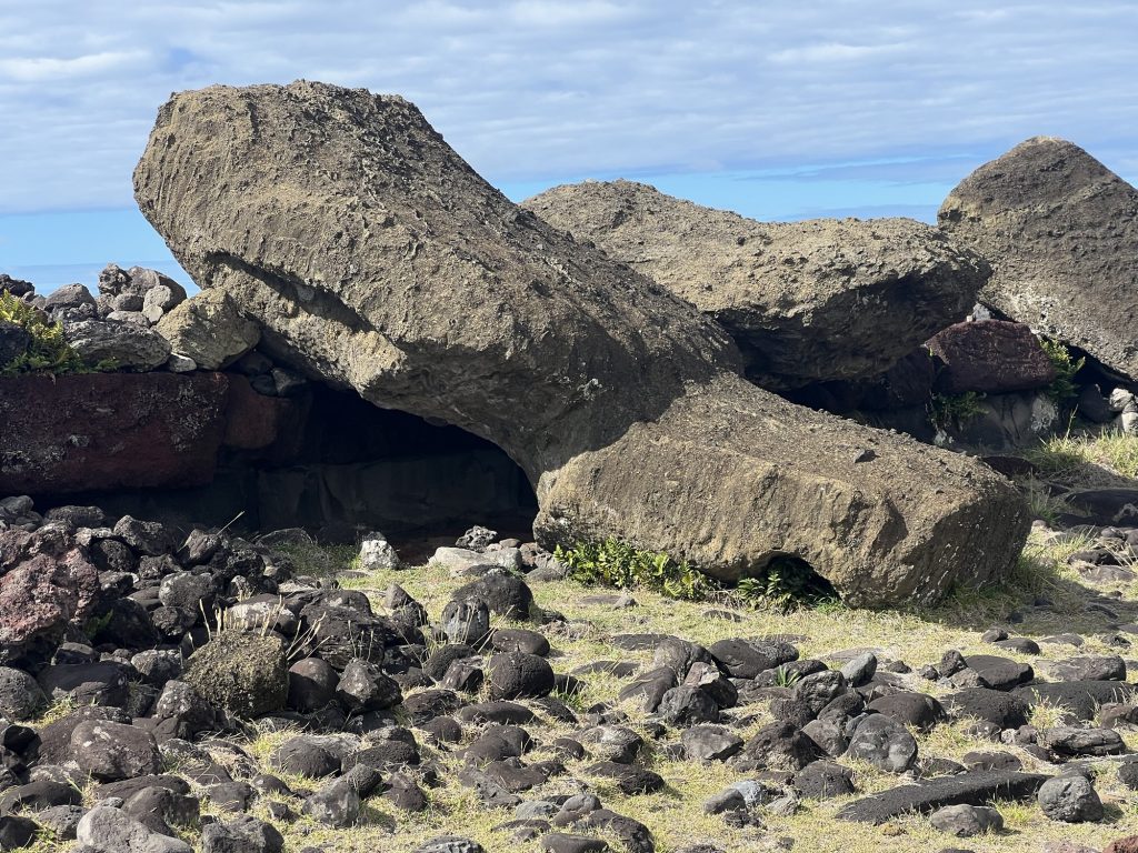 Ab ca. 1880 spätestens sind alle Moai umgekippt worden, fast immer aufs Gesicht. Dieses einschneidende Ereignis, das bereits vorher begann und die Änderung der Gesellschaftsform hin zum Vogelmann Kult, s.u..